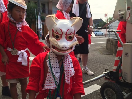 この狐のお面をかぶっているのは、かわいい4歳の男の子。