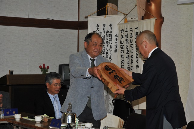 日向東ロータリークラブ、黒木耕作新会長から、新ガバナーの好きな言葉を彫り上げた、盾の贈呈がありました。