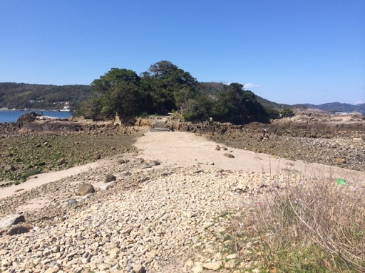 この奥の、こんもりとしたことろにありますが、満潮になると海水で渡ることができなくなります。訪れた日は、ちょうど引き潮にありわたることができました。
