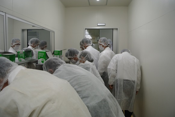 マルイチのお弁当をいただいた後に、二班に分かれ白衣、マスク、キャップ、手洗い、消毒後に構内に入り説明を受けました。