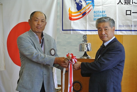 前年度の黒木耕作会長から、新年度の太田勝之会長へ点鐘の木槌が手渡され、新年度が始まりました。