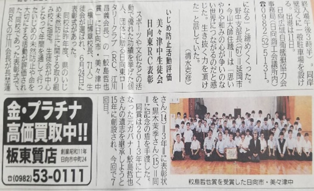 2021-2022年度 西盛 徹 会長2022年6月24日 鮫島哲也賞美々津中学校訪問