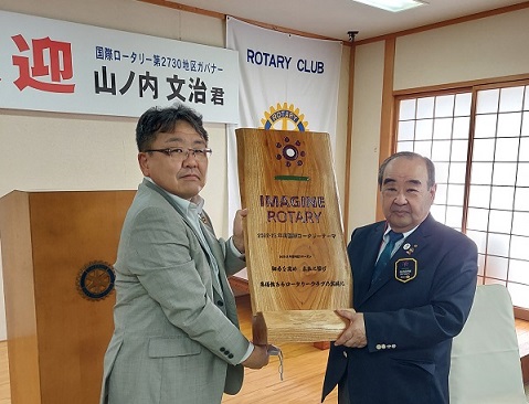 山ノ内文治ガバナー(写真)と、田島幹洋ガバナー補佐へ贈呈